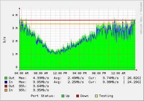 Each and every switch port on our network is monitored for bandwidth, errors, discards and other anomalies. You have 24×7 web-based access to graphs that detail your bandwidth utilization by speed, and data transfer over time. You can also monitor your server health (CPU, disk use, memory, disk I/O, system load average). As an additional service, we can set alerts for you if thresholds are exceeded.
